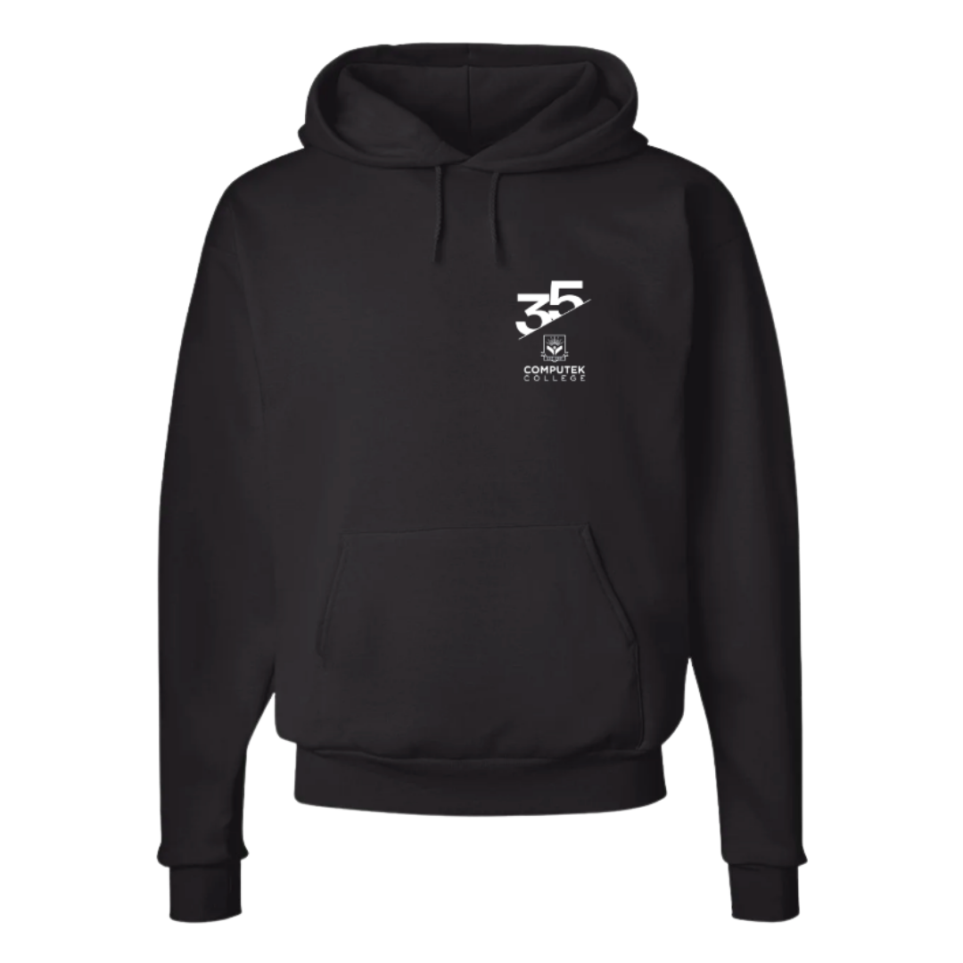 Experience comfort blended with casual style in this versatile hoodie, great for chilly days or lounge-worthy weekends. Its ample pouch pocket and cosy fit make it an ideal companion for outdoor activities or simply for relaxing at home. Features coverstitched armholes and waistband with embroidered 35th-Anniversary Computek College logo.